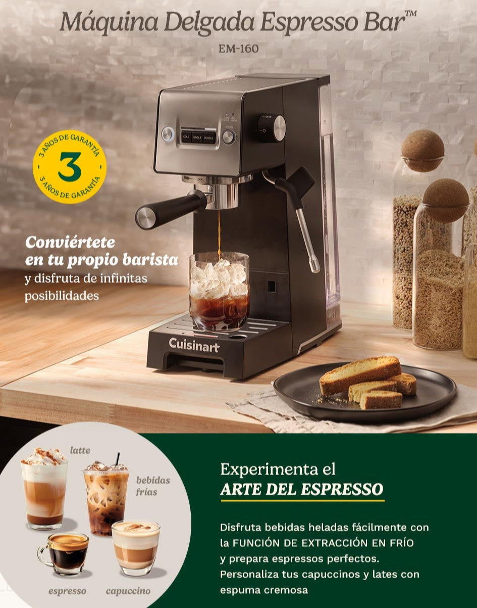 Disfruta la experiencia de una cafetería en casa con la máquina de espresso Cuisinart Espresso Bar. Equipada con 20 bares de presión, portafiltro sin fondo y varilla de vapor, esta cafetera permite preparar espressos intensos, capuchinos cremosos y bebidas frías con facilidad.